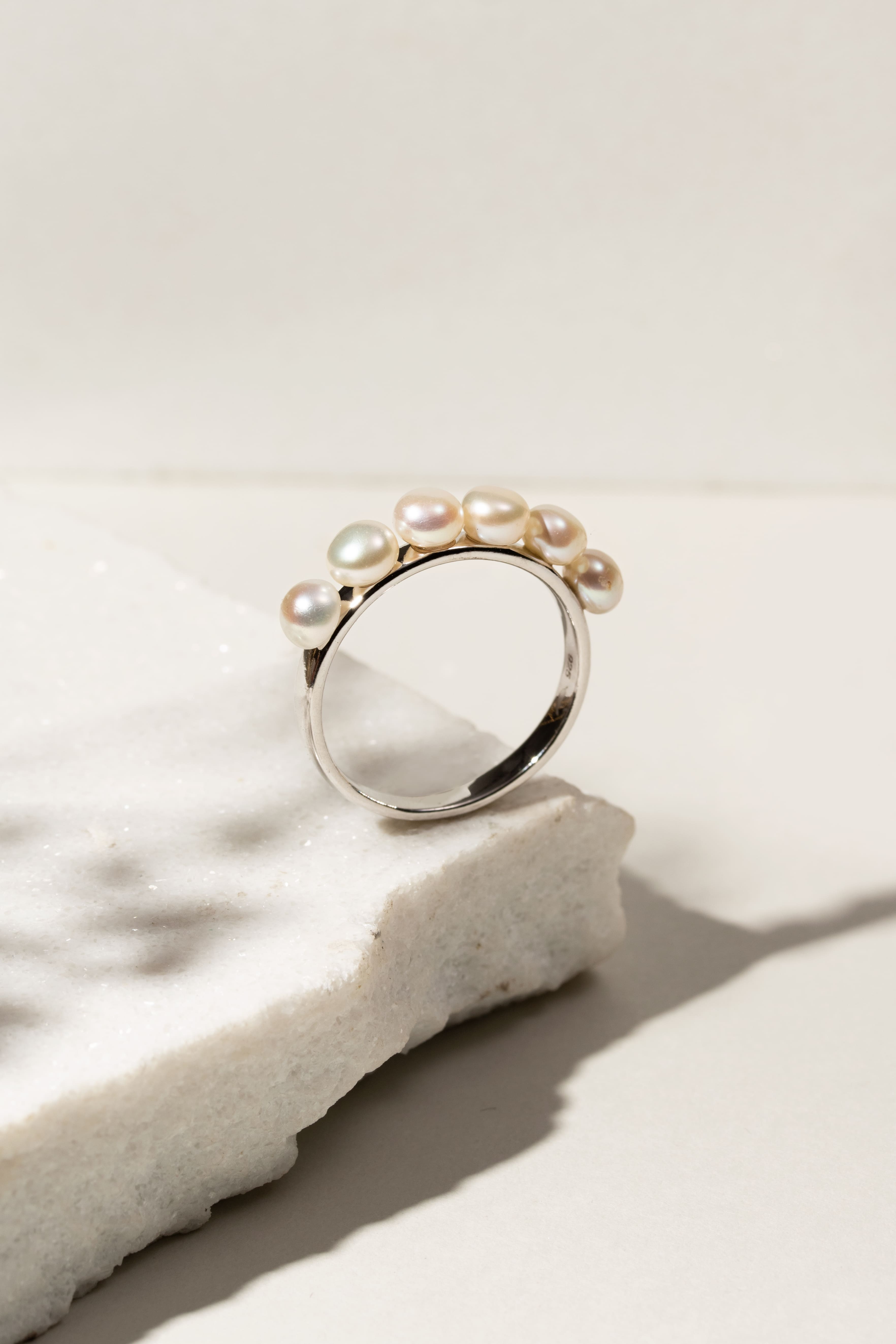 Meia aliança em prata 925 com espesso banho de ouro branco e 6 meia-pérolas de água doce.